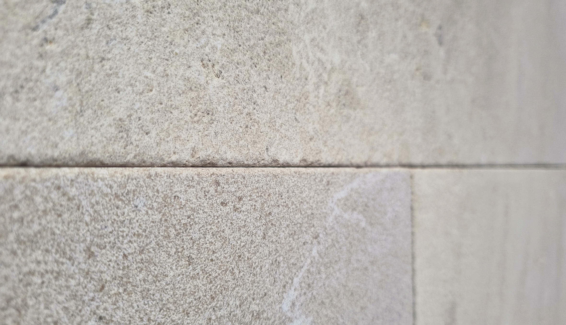 Es una caliza marmórea muy densa y dura que suele presentar vetas de calcita. Tiene un agradable tacto texturado y patinado y sus tonos están dentro de los arena, moka, crema y gris cálido. Sus cantos presentan ligeros desconches para darle un aspecto algo desgastado/erosionado.